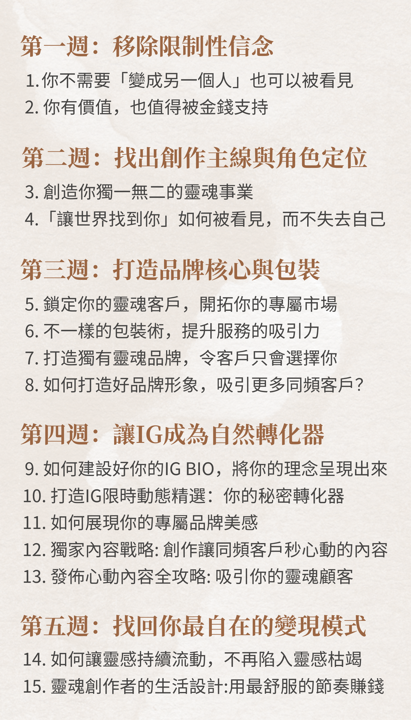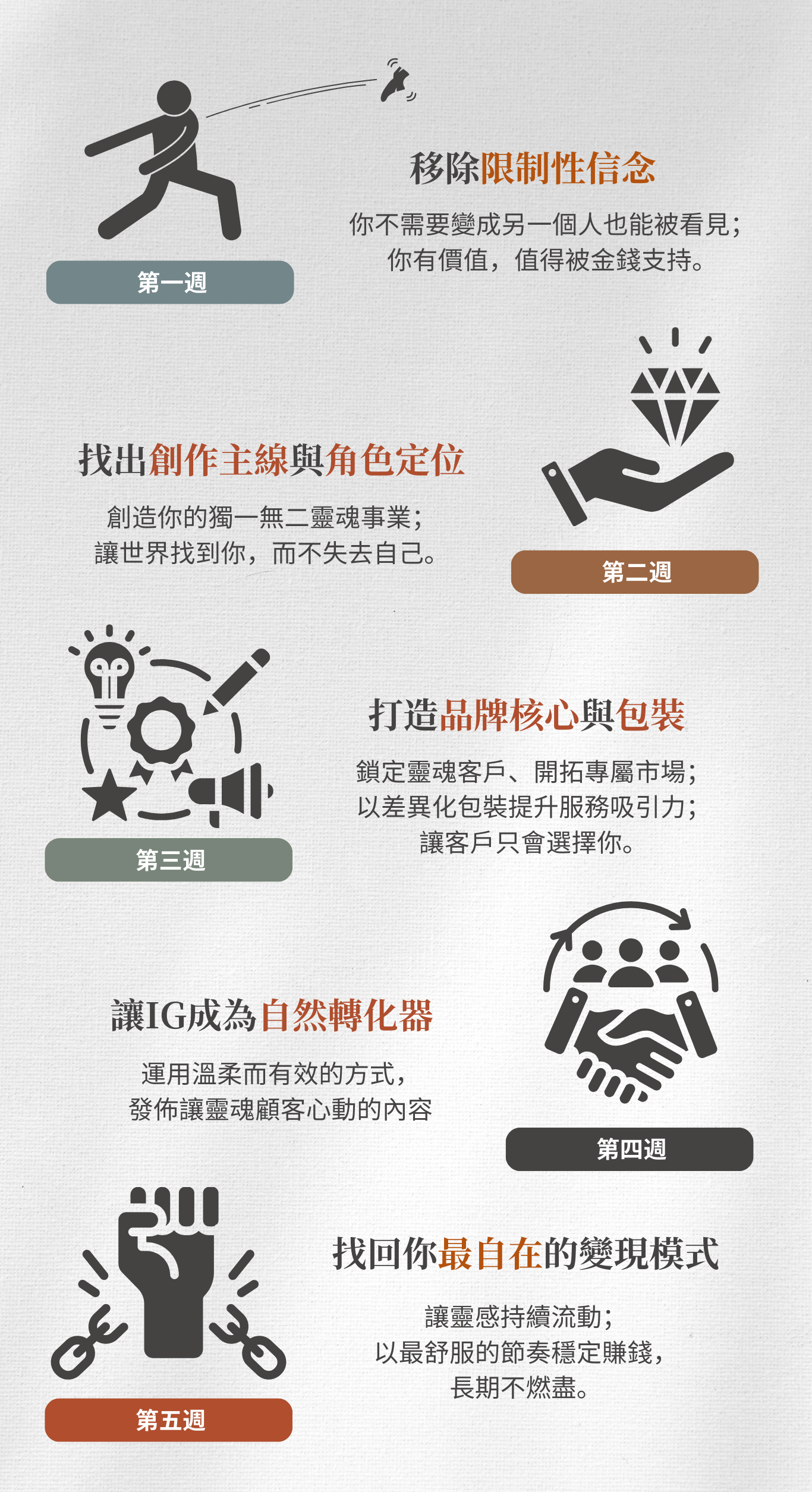 直到我放下所有「成功方程式」,回到最真實的自己,找到了那條從容、不焦慮、不妥協,平衡個人喜好與大眾需求的事業成長方法,生意再次自然流動起來。因此,我現在協助「靈魂型創業者」(療癒師、藝術家、教練等)和「焦慮的創業家」找到專屬於你的事業節奏,讓你不用扭曲自己,也能被對的人看見,並從中獲得豐盛與自由 —— 在世界上任何一個你喜歡的地方、用你喜歡的方式,賺到你理想的收入數字。