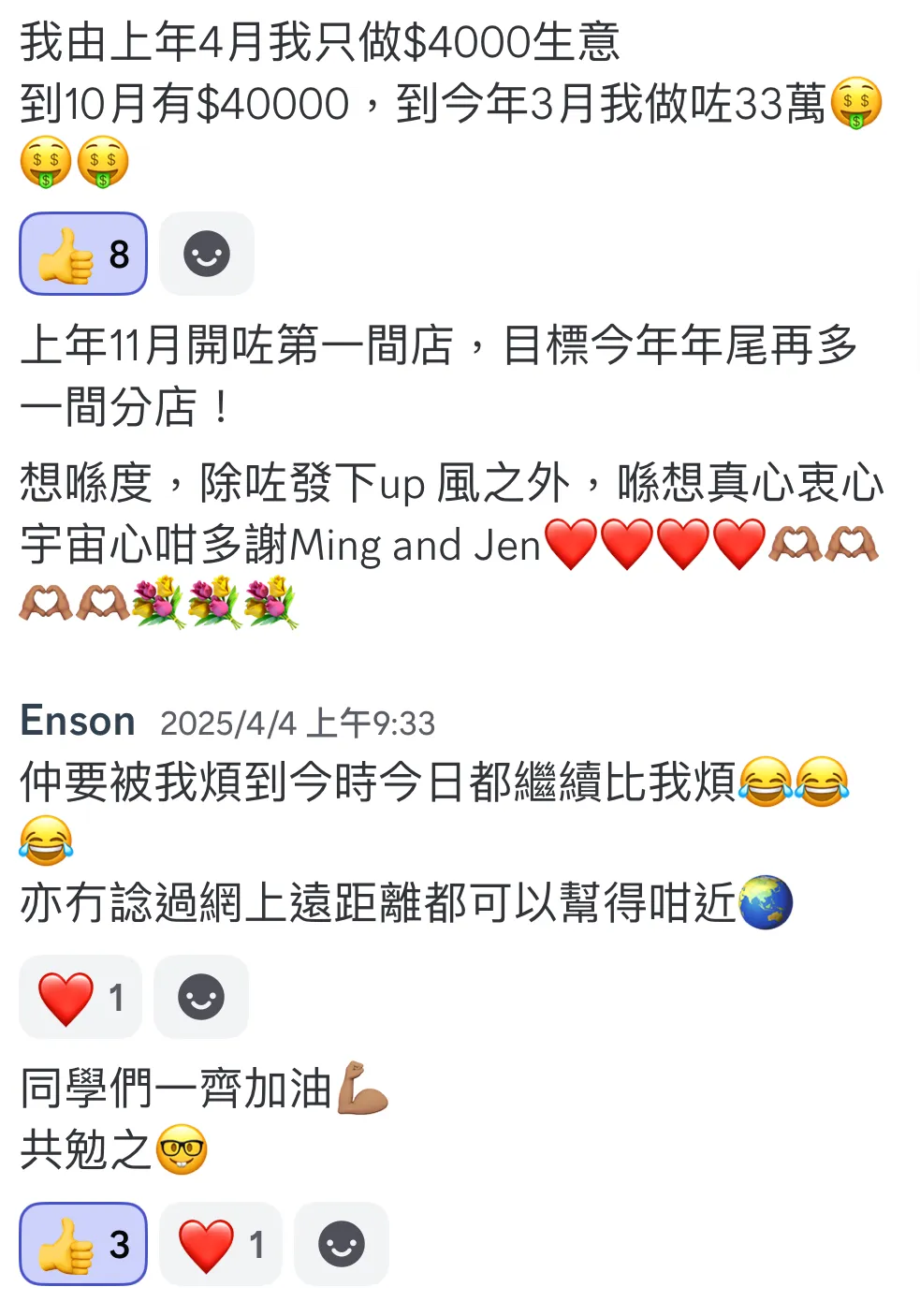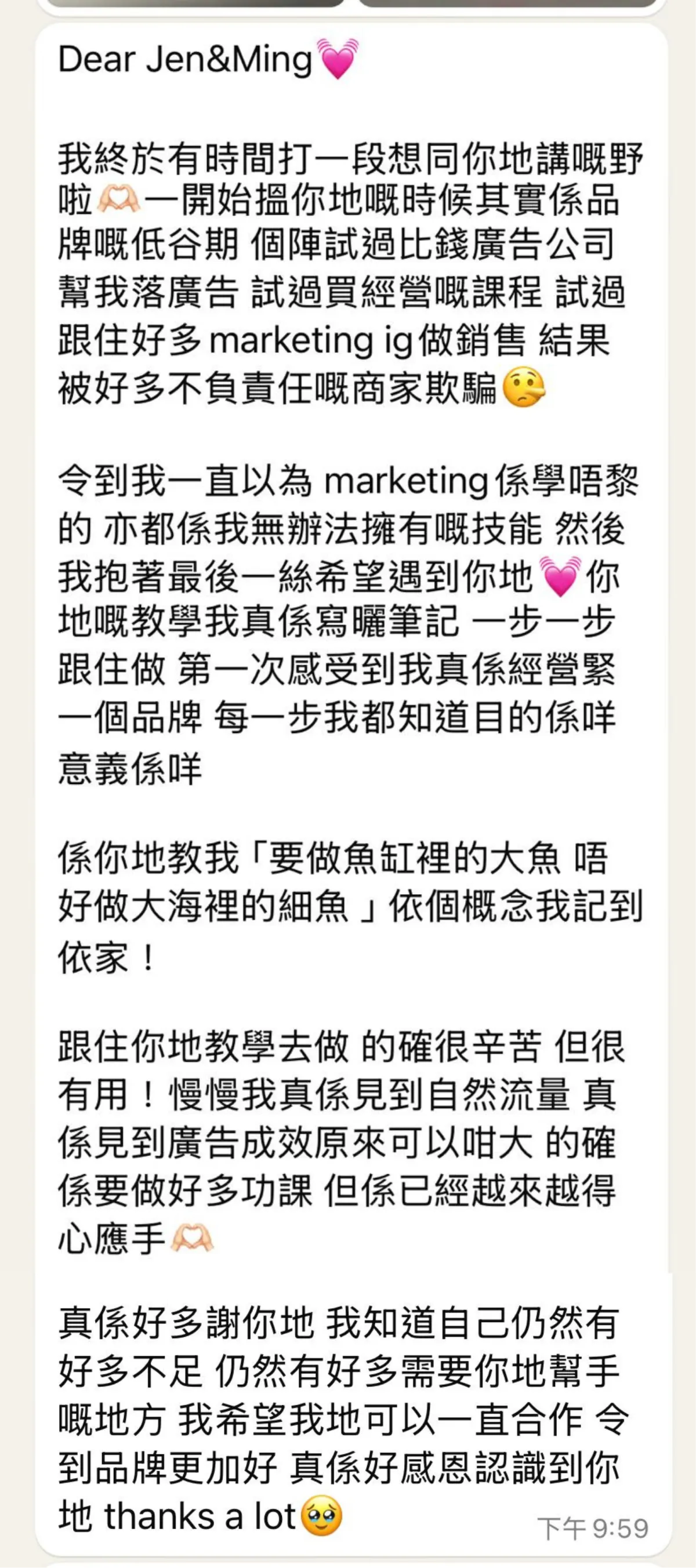 終於,在經歷了六年的磨練,我們發現最熱愛的其實是marketing,特別是幫人重生生意那一刻。那種滿足感不能簡單言語去形容——見到客戶因為我們而找到希望,感激到眼淚都流出來,這些都是支持我們繼續向前行的最大動力。